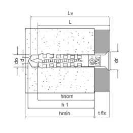 | Références | Réference produit | Dimensions [d0xL] [mm] | Ep. max élément à fixer [tfix] [mm] | Profondeur mini perçage [h1] [mm] | Profondeur d’ancrage nominale [hnom] [mm] | Ep. mini support [hmin] [mm] | Ø vis [d] [mm] | Longueur vis [Lv] [mm] | Ø colerette [dr] [mm] |