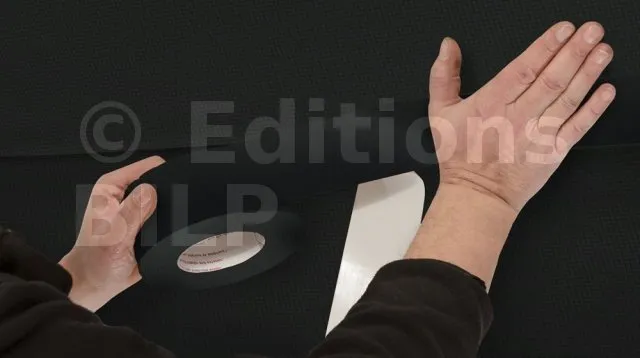 - MatériauColle en acrylique pur, exempte de solvants et de plastifiants, appliquée sur un film PE armé noir et associée en sous-face à un film pelable.
