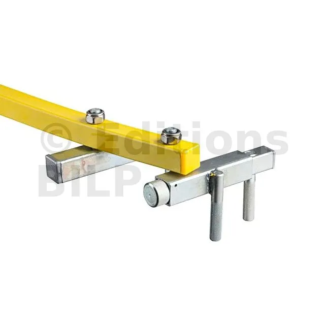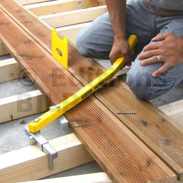 Pour éviter d’endommager la languette des lames encliquetables lors de la pose avec la pince à caillebotis Metsäpro, utilisez des chutes de lames et placez-les entre la lame et la cale de la pince avant de serrer.