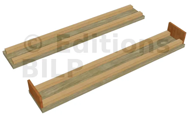 Le fond de moule est composé d’une planche de 20, d’une longueur de 1,20 m, munie de deux lattes de 1,17 m, clouées à 1,5 cm du bord des arêtes pour laisser l’emplacement des joues en contreplaqué de 15 mm. Sur ce fond de moule, les deux abouts de dimensions 10 cm x 17 cm sont vissés aux lattes.