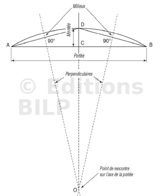 L’arc surbaissé se trace comme suit. Nous connaissons la portée AB et la montée CD. Tracer AD et BD puis prendre les médiatrices de AD et BD ce qui nous donne le centre de l’arc.