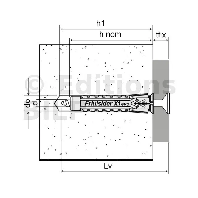 | Références | Dimensions [d0xL] [mm] | Ø vis (Min/Max) | Ø perçage [d0] [mm] | Profondeur mini perçage* [h1] [mm] | Profondeur d’ancrage nominale* [hnom] [mm] | |