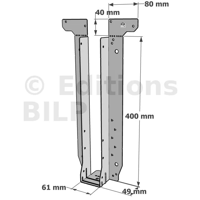 - Étrier fourni avec ses brides supérieures droites, pliables sur chantier afin de s’adapter à toutes les hauteurs de solives,