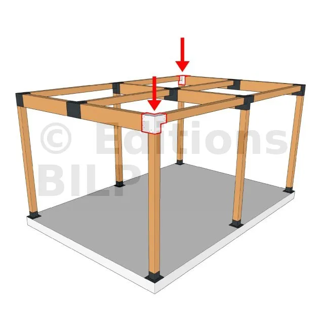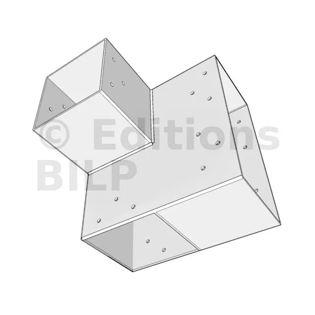 Il est utilisé dans un angle extérieur. Ce connecteur va permettre de raccorder une grosse poutre 240x120mm perpendiculairement à une poutre 120x120mm, le tout étant supporté par un poteau vertical 120x120 mm.