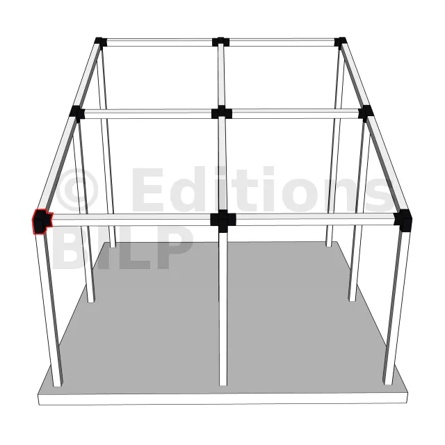 Il est utilisé dans un angle extérieur. Ce connecteur va permettre de raccorder une poutre 120x120mm à une poutre 120x120mm avec une pente de 20°, le tout étant supporté par un poteau vertical 120x120mm.