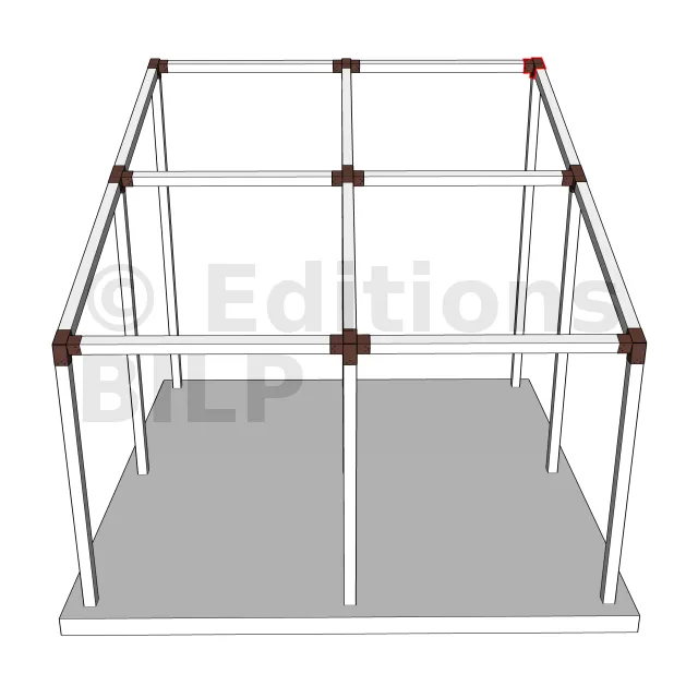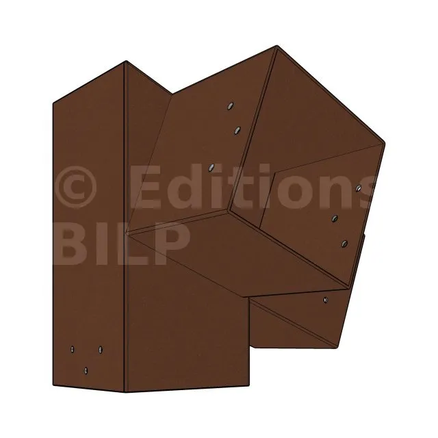 Il est utilisé dans un angle extérieur. Ce connecteur va permettre de raccorder une poutre 120x120mm à une poutre 120x120mm avec une pente de 20°, le tout étant supporté par un poteau vertical 120x120mm.