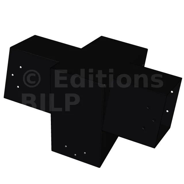 Connecteur d’angle intérieur à quatre directions conçu pour l’assemblage de poutres en section 120x120 mm avec un chevron de même section incliné à 20°. Il assure la jonction structurelle entre les éléments horizontaux, le chevron incliné et un poteau porteur vertical en 120x120 mm.