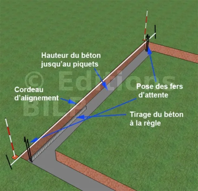 Il est même nécessaire de talocher la surface du béton en fin de coulage. Dès la fin du coulage, quand le béton n’a pas encore fait sa prise, il est primordial de tendre les ficelles et de planter les fers d’attente des chaînages verticaux d’angle.