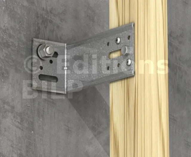 1. Fixation des équerres : la fixation sur le porteur béton s’effectue avec un ancrage de ∅8 placé dans le trou oblong le plus haut.