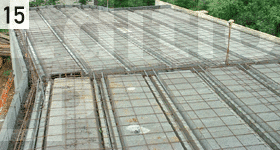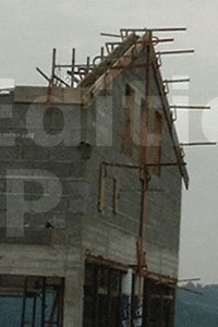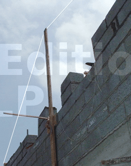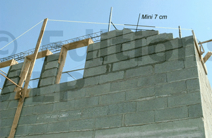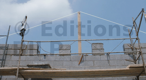 Les cordeaux sont posés à la hauteur d’arase. De plus, trois fenêtres sont prévues dans les chambres et la salle de bain de l’étage. Sur cette construction, il n’y a pas de plancher en béton ; il sera composé de solives et de parquets. Une arase brute en agios retournés et taillés de 7 à 10 cm est réalisée sous l’arase finie, avec du ferraillage et un coffrage. Ensuite, le coulage est effectué avec la pose des appuis de fenêtres ainsi que des tablettes préfabriquées à deux pentes (pour l’écoulement) sur les autres parties du chantier.