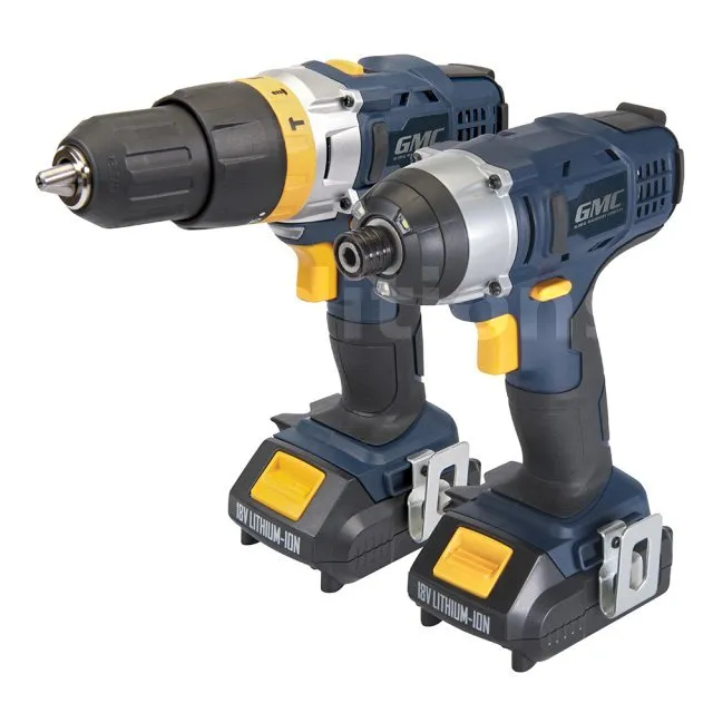 Ensemble perceuse sans fil et visseuse à chocs 18 V avec batteries Li-ion 1,5 Ah et chargeur intelligent 1 heure. Engrenages tout métal, poignées anti-vibrations caoutchoutées.