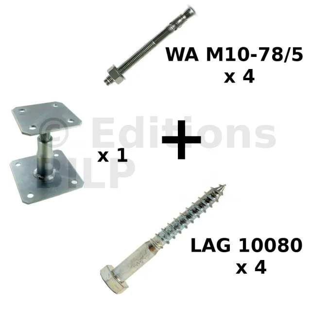 - Contenu1 x pied de poteau APB100/150 acier éléctrozingué ; 4 x goujons WA M10-78/5 en acier électrozingué (FM-753 3DG M10X75/5) ; 4 x tirefonds LAG10080