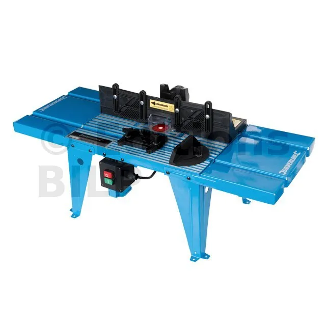- ContenuTable en fonte d'aluminium ; 2 x Rallonges de table ; Manuel d'instructions ; Rapporteur ; Boîtier de commande ; Dispositif de serrage pour gâchette de défonceuse ; Guide principal ; Guide ajustable ; Protection ; 2 x Peignes verticaux ; Peigne horizontal ; Table de défonceuse