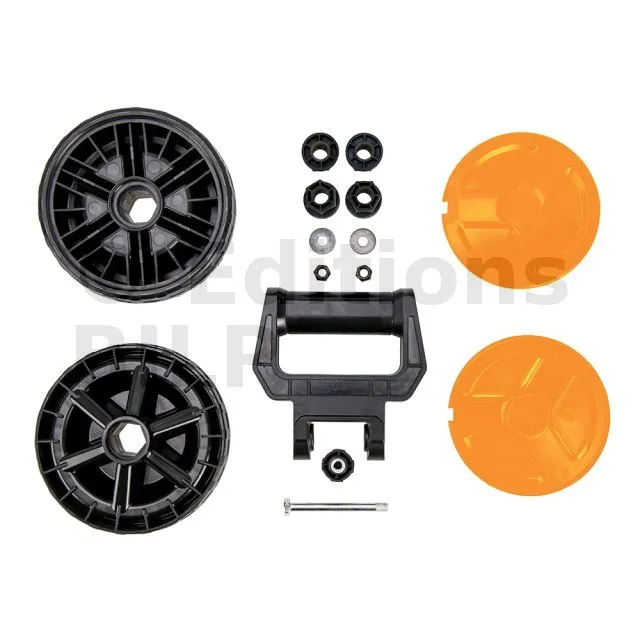 Roues de large diamètre, adaptées au transport du Workcentre (Poste de travail polyvalent) sur terrain irrégulier. Roues rainurées sur toute la circonférence pour une traction maximale en toutes circonstances. Palier à glissement et rondelles pour garder les roues alignées dans l’axe et minimiser l’usure et le désaxement. Enjoliveur pour protéger les composants internes des saletés et des débris. Poignée de transport moulée en ABS résistant. Montée sur pivot pour plus de confort lors de l’utilisation. Large poignée pour une bonne distribution des forces lors du transport.