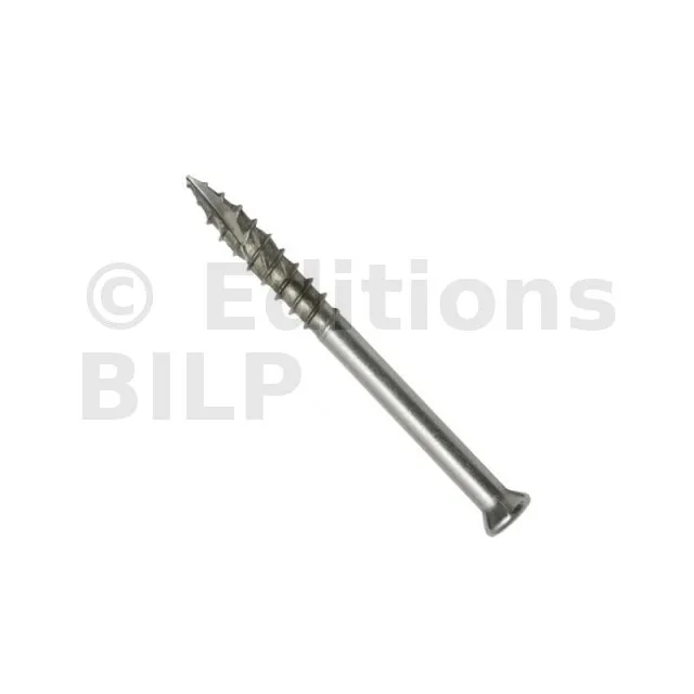 La vis en Inox A4 offre une sécurité optimale grâce à sa résistance à la corrosion, essentiellement pour les bois durs tropicaux (Bangkirai, Massanduba, Ipé, Garapa, Cèdre rouge, Bilinga, Cambara, Jatoba, Red Balau).