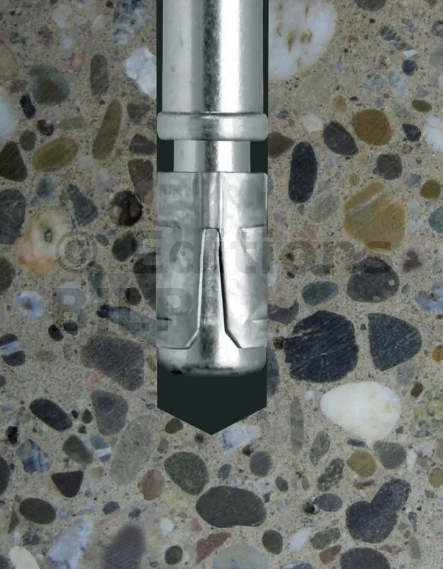 Lors de l’application du couple de serrage, le cône remonte dans la bague d’expansion qui provoque une ruptures des segments en s’ouvrant et viennent se plaquer contre la paroi, entraînant ainsi une adhérence par frottement sur le matériau support. Il en résulte un ancrage par expansion par vissage à couple contrôlé.