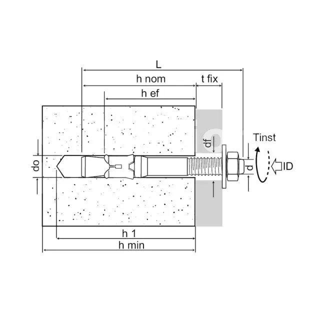 | Références | Référence produit | Dimensions [ØxL] [mm] | Ø perçage [d0] [mm] | Prof. min. de perçage [h1] [mm] | Ø perçage dans pce à fixer (au travers) [df] [mm] | Ouverture de clé sur plat [SW] [mm] | Couple de serrage [Tinst] [Nm] | Prof. ancrage [hef] [mm | Ep. mini du support [hmin] [mm] |