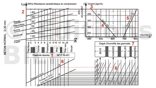 On désire un béton très plastique (affaissement 11 cm), avec une résistance élevée de 35 MPa (environ). On suppose que les granulats sont simplement « humides ».