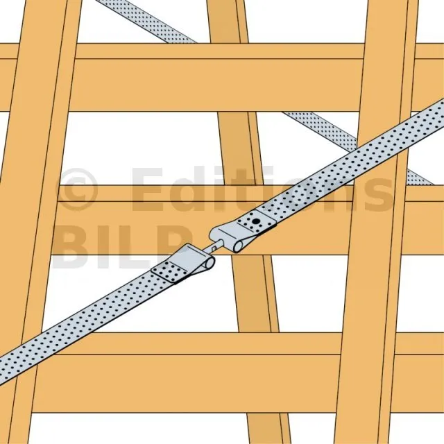3. Fixer l’autre extrémité de ces deux feuillards au tendeur FMBS afin de les associer au centre de la diagonale.