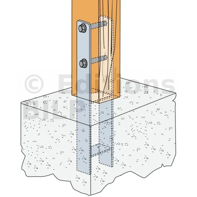- Écartement fixe qui maintient la fibre neutre du poteau hors zone de contact béton/bois.