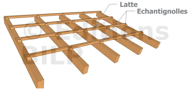 Reprise des poussées de pannes : La pose de pannes déversées nécessite la mise en œuvre de dispositifs de reprise de poussées, selon un plan parallèle à celui de la couverture. On interpose entre toutes les pannes intermédiaires des entretoises. La poussée en partie basse est alors reprise par deux décharges.