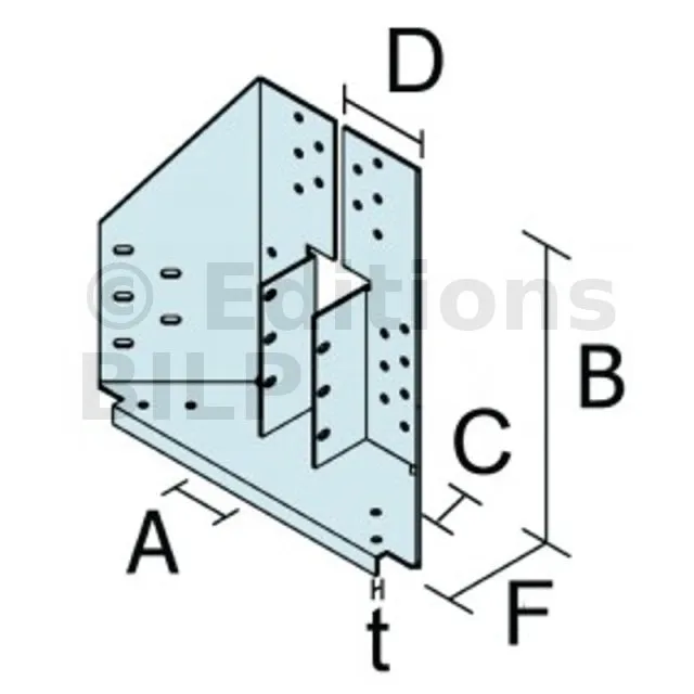 Les entraxes et les distances au bord doivent être vérifiés selon les règles de l’Eurocode 5, pour le groupe de 10 pointes situées dans la partie haute de l’étrier, en fonction de l’épaisseur du support et de la dimension de l’élément vertical. L’utilisation d’un porteur d’épaisseur 147 mm doit également être vérifiée.