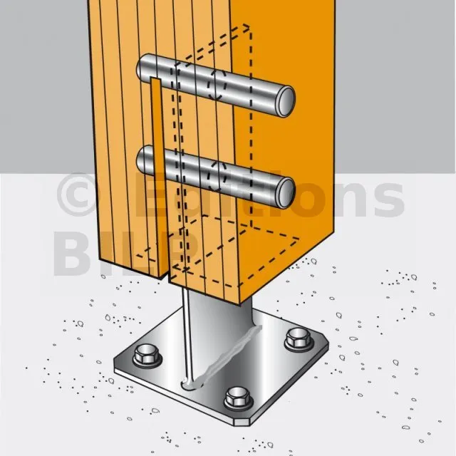 - Connexion bois sur support rigideSur poteau : 2 broches Inox Ø12 ou Ø16 ou Boulons inox Ø 12 mm ou 16 mm suivant perçages ; sur béton : 4Ø12 (goujons BOAX-II M12-104/5 A4 ; tige filetée M12) ; sur acier : Boulons inox Ø12