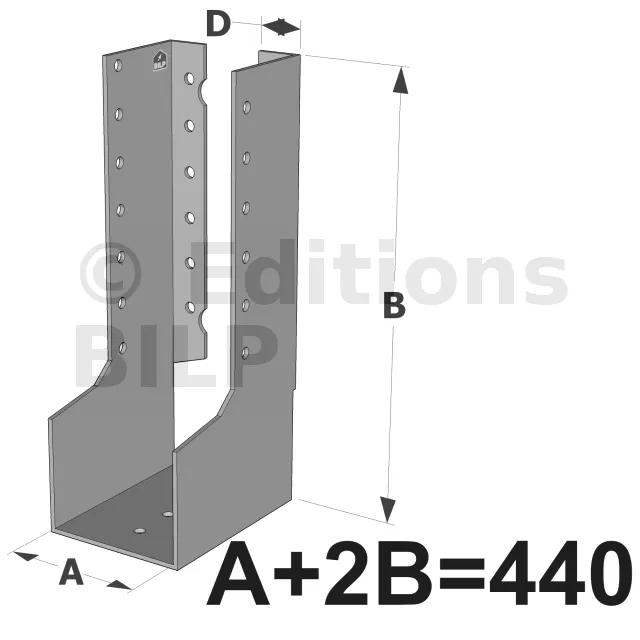 ATTENTION, pour les sabots SAI-SAIL à ailes intérieures de largeurs inférieures à 64 mm (SAI) et 80 mm (SAIL), les ailes sont recoupées sur la hauteur dans l’axe des perçages de boulons. La fixation sur le porteur est donc uniquement possible par pointes ou vis dans la ligne verticale de perçages Ø5 proche du pli. Exemple : SAI200/42/2 ; SAIL340/50/2