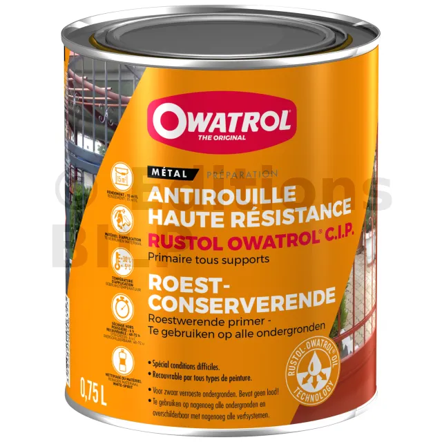 - RUSTOL C.I.P. est tout spécialement recommandé en sous-couche lorsque des peintures bicomposants ou à fort pouvoir solvant (uréthanes, époxydes, caoutchouc chloré, synthétiques carrosserie,...) viennent en recouvrement.
