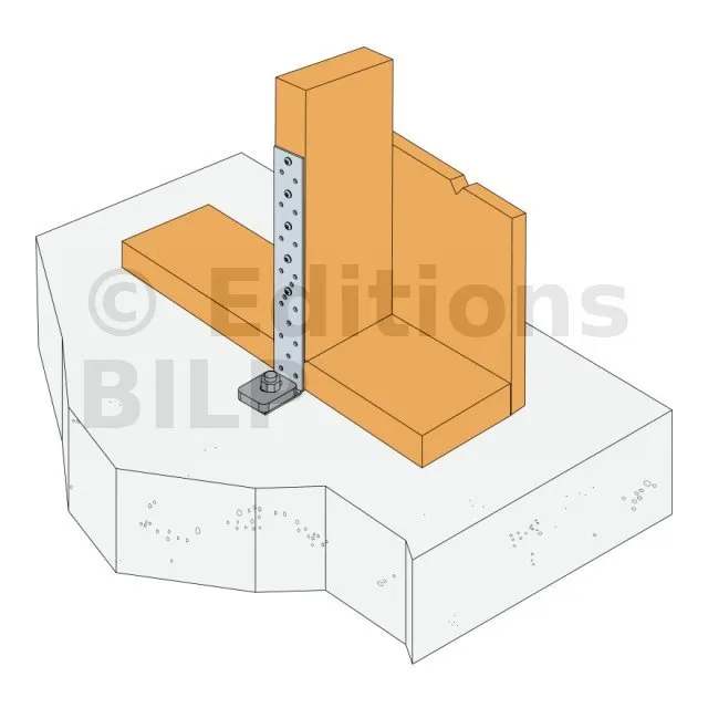 - Ancrage chimique : résine AT-HP + tige filetée LMAS M12 avec un tfix supérieur à l’épaisseur de bois à traverser + 12 mm.