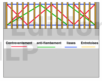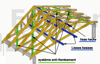 Les barres anti-flambement s’opposent aux déformations dues aux charges permanentes et climatiques. Ce sont des pièces de bois clouées sous les arbalétriers selon un angle d’environ 45°. Elles sont placées du faîtage vers les appuis. Toutes les pièces d’un même versant doivent être traversées par une barre anti-flambement.