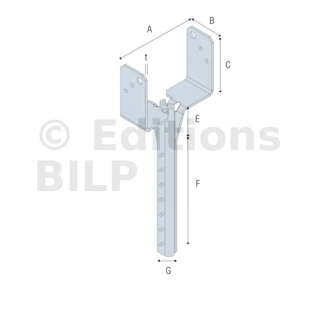 | réf. | A | B | C | E | F | G | t | perçages haut | bois | béton | R1,k | R2,k |