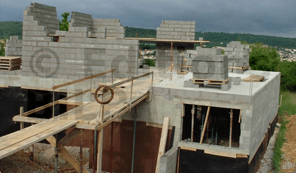 Un trou est effectué à chaque base d’ agglo de tête (chaînages verticaux) afin de pouvoir nettoyer le mortier de montage avant le coulage des raidisseurs. Si cette opération n’est pas exécutée, une trentaine de cm de mortier de montage se déposerait au fond du chaînage ce qui entraînera un point faible sur la base du chaînage vertical.