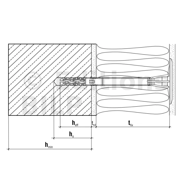 Longueur minimale de la cheville Ld = tfix + ttol + heff avec tfix : épaisseur maximale des pièces à fixer, ttol : épaisseur des sous-couches (adhésif + enduit existant), heff : profondeur d’ancrage.