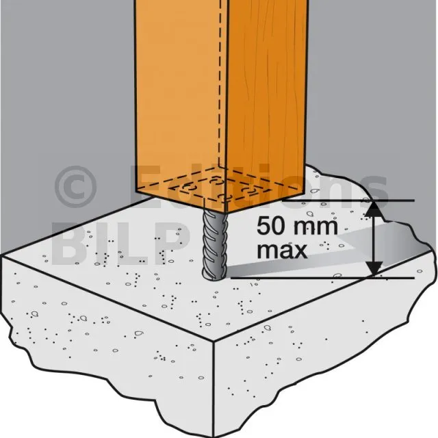 En auto construction, on prend souvent 300 mm, mais ici, pour conserver la certification ETA-07/0285, la tige de 200 mm doit être entièrement entourée de béton ; comptez donc mini 350 mm de profondeur de forage ou de plot.