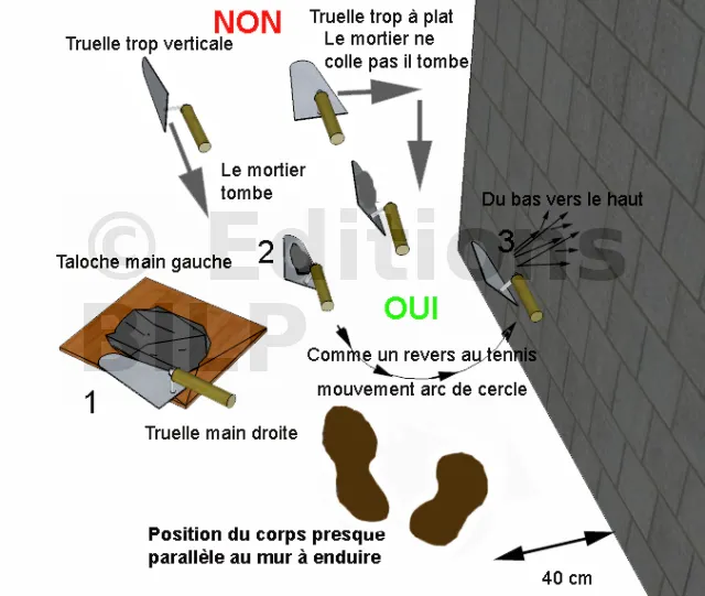 - La truelle est maintenue comme une raquette de tennis ou de tennis de table en prise revers. Le mouvement est régulier, sous forme d’un arc de cercle, projetant le mortier de bas en haut sans exercer de force.