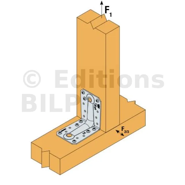 Seuls les efforts F1, F2 et F3 pour des assemblages à 2 équerres sont présents sur cette fiche. Pour plus d’information, consulter l’ETE de Simpson Strong-Tie.