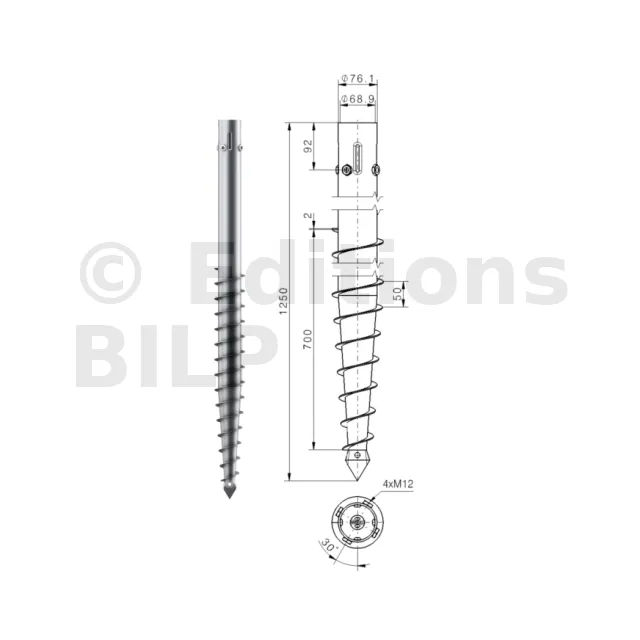 Une vis de fondation est donc composée d’un axe central avec :