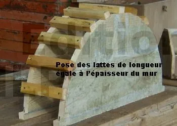 Les lattes sont découpées à la largeur du linteau moins deux épaisseurs de contreplaqué de 15 mm, soit 17 cm. Elles sont positionnées tous les 7 cm environ et clouées ou vissées aux joues. Elles servent de raidisseurs pour le contreplaqué supérieur de 5 mm.