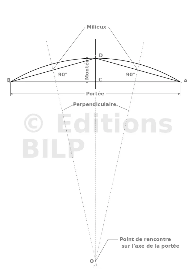 L’arc surbaissé se trace comme suit : en connaissant la portée AB et la montée CD, tracez AD et BD. Ensuite, prenez les médiatrices de AD et BD pour trouver le centre de l’arc.