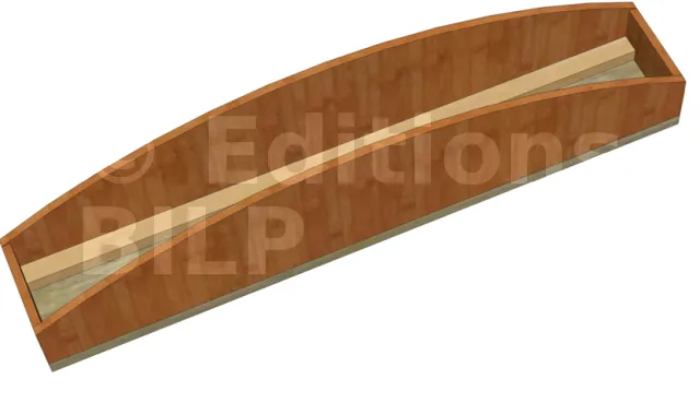 Le fond de moule est composé d’une planche de 20, d’une longueur de 1,20 m, munie de deux lattes de 1,17 m, clouées à 1,5 cm du bord des arêtes pour laisser l’emplacement des joues en contreplaqué de 15 mm. Sur ce fond de moule, les deux abouts de dimensions 10 cm x 17 cm sont vissés aux lattes.