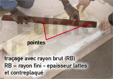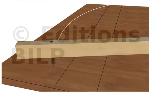 Pour une grande précision, le traçage de l’arc de cercle s’effectuera à l’aide d’une latte et de deux pointes : une pour le centre et l’autre pour le traçage. Le traçage à la ficelle n’est pas recommandé.