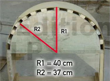 Pour votre épure, vous obtenez deux rayons : le rayon fini et le rayon brut. Celui-ci est calculé en enlevant de la mesure du rayon fini, l’épaisseur du contreplaqué et l’épaisseur des lattes, si celles-ci se posent au-dessus des planches, comme sur ce modèle.