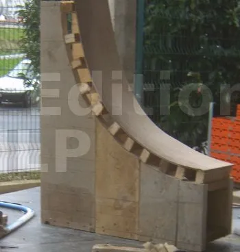 Pour cette arase arrondie, nous utiliserons également un négatif que nous placerons dans le coffrage du voile. Sa réalisation s’effectue en un traçage précis des planches accolées puis découpées et asse[...]