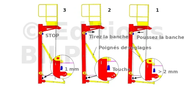 La ligne de jour (espace entre le plomb et la banche) doit être la plus petite possible. Si le jour est trop important, il faut pousser la banche en serrant le tire-pousse (fig. 1). Si le plomb touche, il faut tirer la banche en desserrant le tire-pousse (fig. 2). Ceci permet d’obtenir un jour inférieur ou égal à un millimètre. Vos extrémités de banche sont plombées (fig. 3).