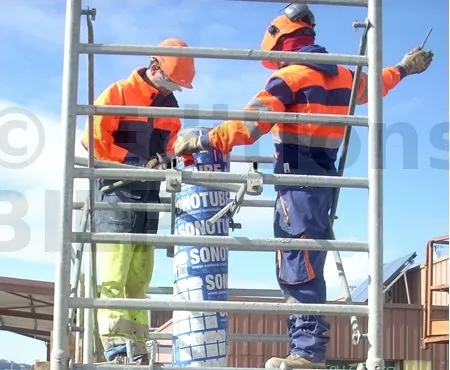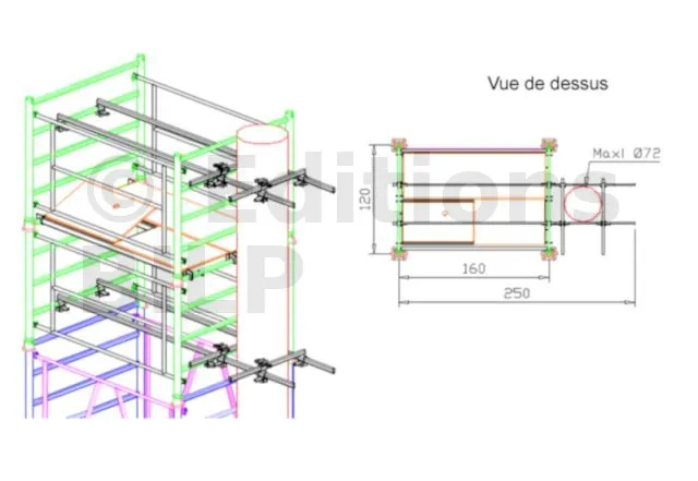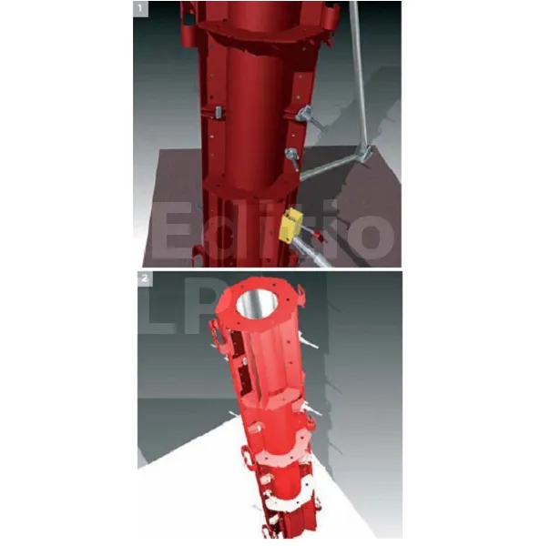 Une fois la talonnette (en béton) réalisée, vous pouvez procéder en utilisant une tranche de poteau en carton ou un cadre en bois carré avec un côté correspondant au diamètre du poteau en carton. Ensuite, il suffit de monter une tour d’échafaudage autour du poteau pour l’aligner verticalement et maintenir le coffrage en place à l’aide de barres coulissantes spécialement conçues à cet effet ou tout autre moyen efficace.
