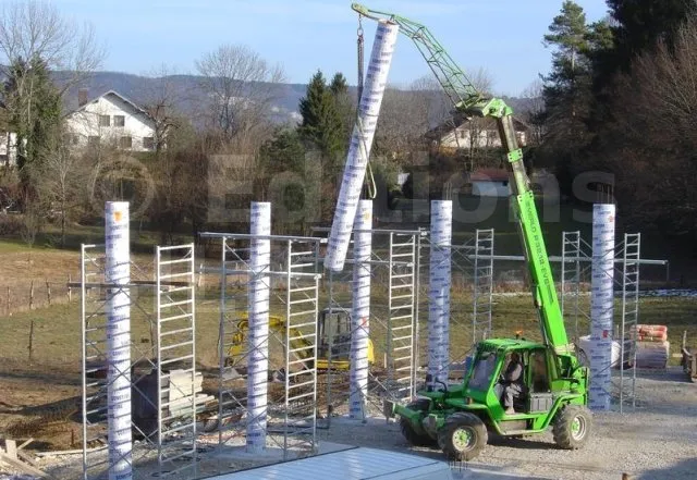 Une fois la talonnette (en béton) réalisée, vous pouvez procéder en utilisant une tranche de poteau en carton ou un cadre en bois carré avec un côté correspondant au diamètre du poteau en carton. Ensuite, il suffit de monter une tour d’échafaudage autour du poteau pour l’aligner verticalement et maintenir le coffrage en place à l’aide de barres coulissantes spécialement conçues à cet effet ou tout autre moyen efficace.