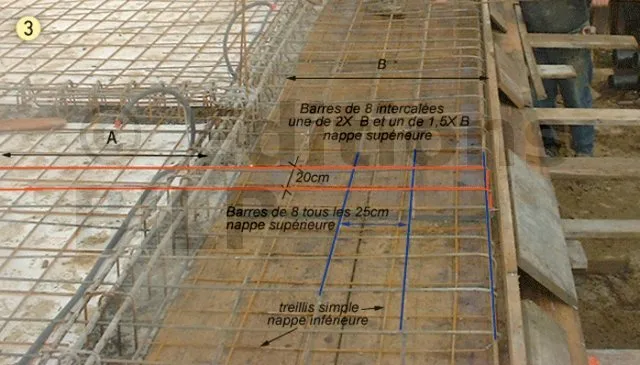 Des barres seront positionnées dans le sens longitudinal tous les 25 cm, puis dans le sens transversal reprenant dans le dallage ou dans la dalle tous les 20 cm avec une forme d’équerre en tête (la partie intérieure sera de la même dimension que sur la longueur du porte-à-faux).