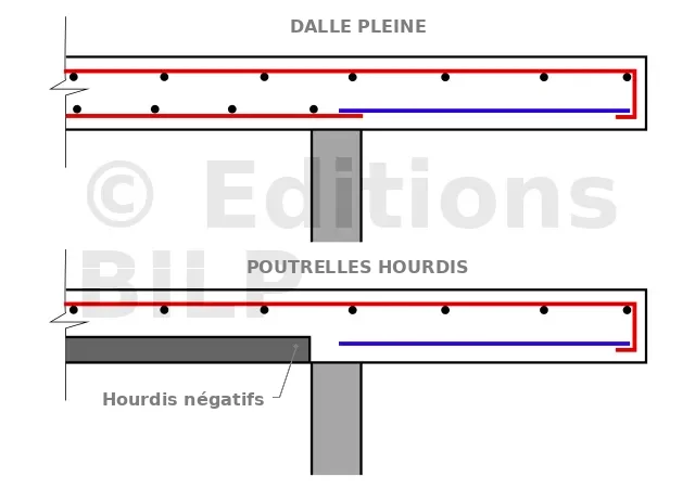 Ces dalles sont renforcées par des aciers placés en partie haute du béton et sont prolongées de la moitié dans la dalle intérieure. Ils peuvent être coffrés sur place en dalle pleine ou préfabriqués.