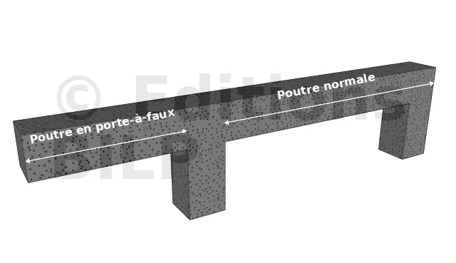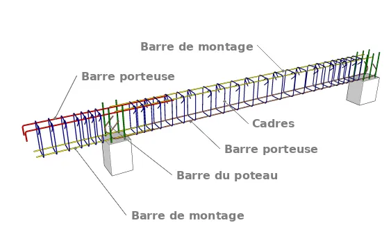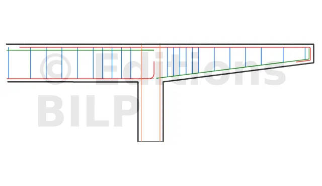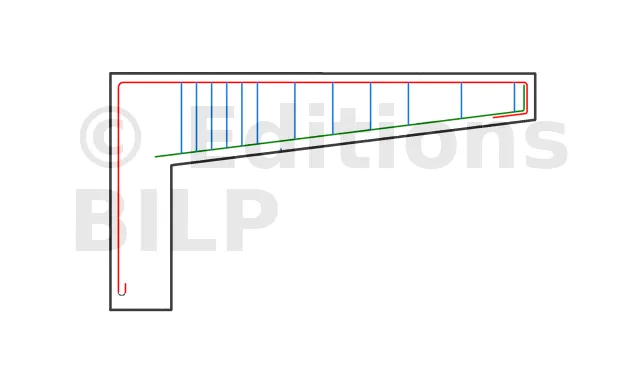 Comme tous les éléments en porte-à-faux, le ferraillage porteur doit se trouver dans la partie supérieure et se prolonger à l’intérieur de la poutre sur une distance équivalente à la longueur du porte-à-faux. Cette pénétration nous sera indiquée par le bureau d’études.